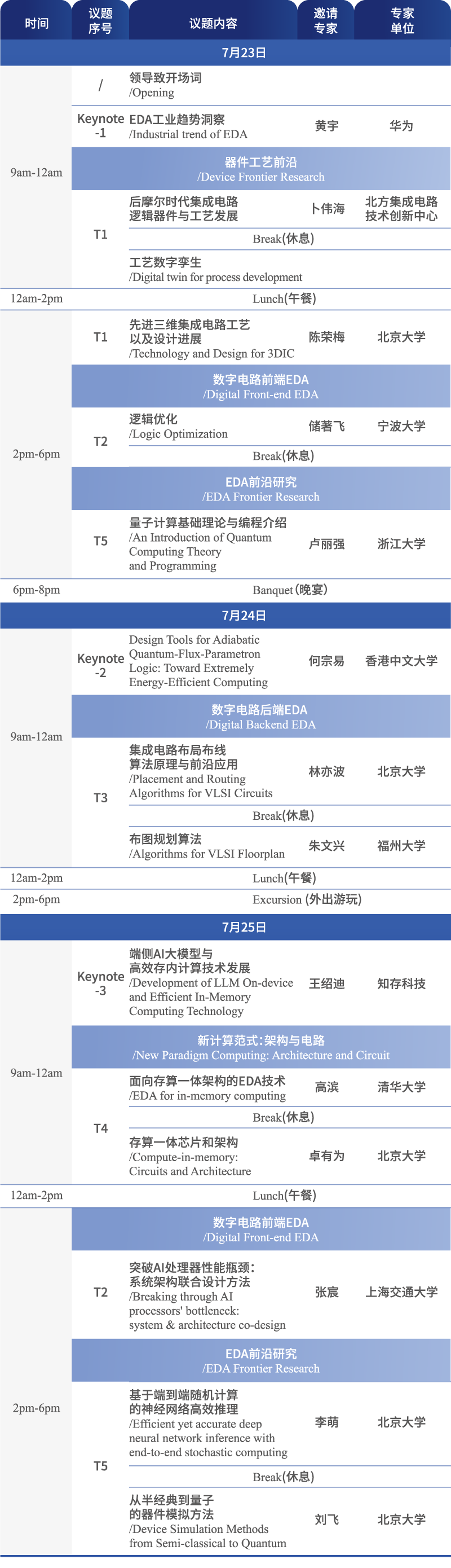 我印象比较深刻的既有存算一体、AI辅助EDA设计、量子计算电路这些学界前沿研究焦点,也安排了布尔代数、逻辑布局布线这些基础回顾,更有业界华为海思、知存科技等业内大咖对未来半导体行业趋势的高屋建瓴,让我在未来教学科研活动中深受启发。